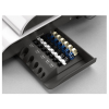 Ergonomiczna. Specjalna. osobna szuflada do przechowywania grzbietów z opatentowanym systemem mierzenia grubości dokumentów i doboru odpowiedniego grzbietu.