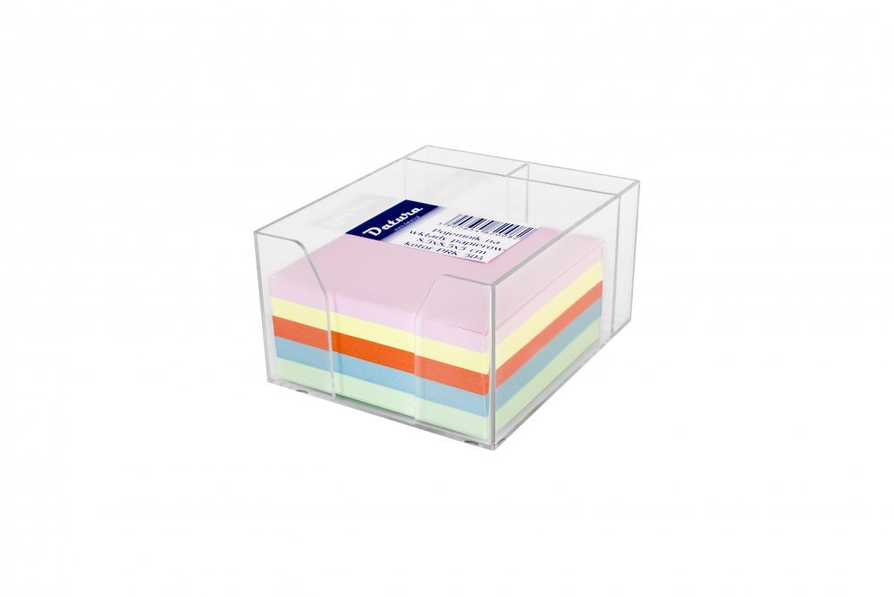 Pojemnik na wkłady papierowe_- plastikowy. przezroczysty_- dostępny z białymi i kolorowymi kartkami 85 x 85 mm_- ułatwia zachowanie porządku na biurku_- jednostka sprzedaży 1 sztuka