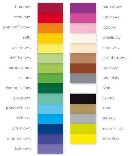 Brystol, dostępny w 26 kolorach z szerokiej palety barw zarówno intensywnych jak i pastelowych: atramentowy, biały, bordowy, brązowy, brązowy jasny, czarny, czerwony, fioletowy, granatowy, kremowy, malinowy, niebieski, niebieski jasny, pomarańczowy, popielaty, różowy, różowy ciemny, seledynowy, srebrny, turkusowy, waniliowy, zielony, zielony jasny, zielony ciemny, złoty i żółty.
