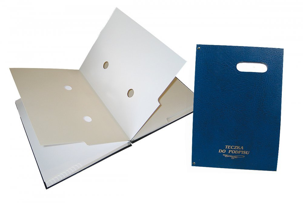 Teczka do podpisu z okienkiem Warta_- okładka twarda oklejana. Grzbiet harmonijka. Łączenie okładki z blokiem wzmocnione nitami. Na przedniej okładce okienko z szybką. pod którą można umieszczać napisy. _- blok z kartonu barwionego w masie zawiera 20 kart z 2 otworami i wyciętymi registrami_- jednostka sprzedaży 1 sztuka
