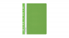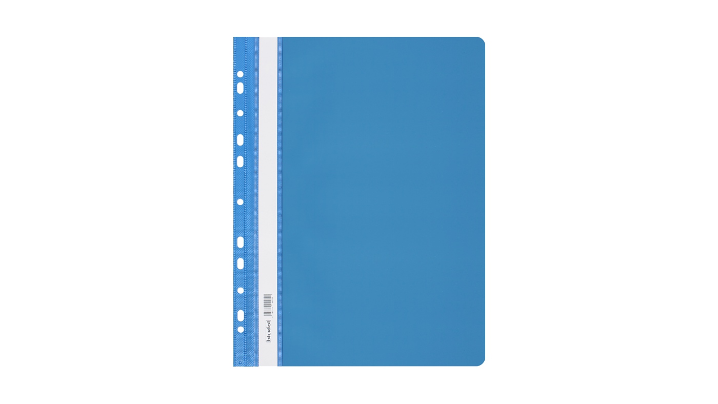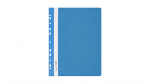 - folia PVC. przód twardy przezroczysty. tył twardy kolorowy_- boczna perforacja umożliwia wpięcie do segregatora z dowolnym ringiem_- w środku blaszka i wąs o długości 16.5 cm. umożliwiający wpięcie dokumentów do 2 cm_- wymienny papierowy pasek do opisu z kodem kreskowym na szt._- dwa wycięcia ułatwiające wysuwanie paska_- zaokrąglone rogi obu okładek