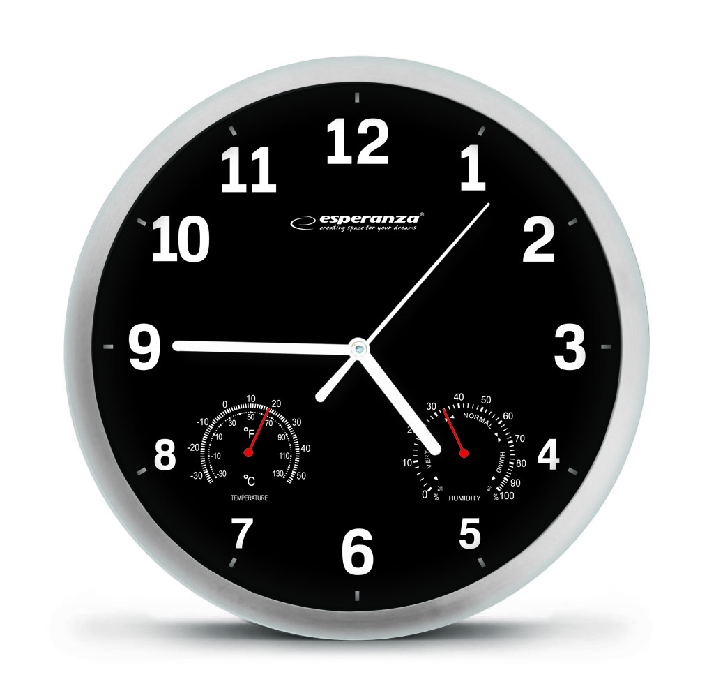Nasz zegar ścienny Esperanza LYON służy nie tylko do pokazywania czasu - można na nim odczytać też temperature oraz wilgotność otoczenia. Jego wzornictwo sprawia. iż udekorujesz nim każde mieszkanie. biuro. sklep czy restaurację.__ ___ Średnica zegara: 25 cm___ Grubość zegara: 3.6 cm___ Rama zegara z wysokiej jakości tworzywa sztucznego___ Tarcza zegara ze specjalnego artystycznego papieru___ Cichy i bardzo precyzyjny mechanizm kwarcowy___ Zakres mierzonej temperatury: -30 _C _ + 50 _C (-30 _F _ 110 _F)___ Zakres pomiaru wilgotności: 0 _ 100%___ Hak do motażu na ścianie w zestawie___ Zasilanie: 1 x bateria 1.5V AA (niezałączona)