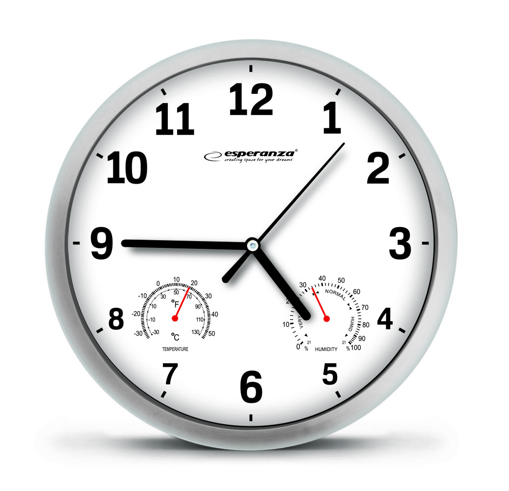 Nasz zegar ścienny Esperanza LYON służy nie tylko do pokazywania czasu - można na nim odczytać też temperature oraz wilgotność otoczenia. Jego wzornictwo sprawia. iż udekorujesz nim każde mieszkanie. biuro. sklep czy restaurację.__ ___ Średnica zegara: 25 cm___ Grubość zegara: 3.6 cm___ Rama zegara z wysokiej jakości tworzywa sztucznego___ Tarcza zegara ze specjalnego artystycznego papieru___ Cichy i bardzo precyzyjny mechanizm kwarcowy___ Zakres mierzonej temperatury: -30 _C _ + 50 _C (-30 _F _ 110 _F)___ Zakres pomiaru wilgotności: 0 _ 100%___ Hak do motażu na ścianie w zestawie___ Zasilanie: 1 x bateria 1.5V AA (niezałączona)