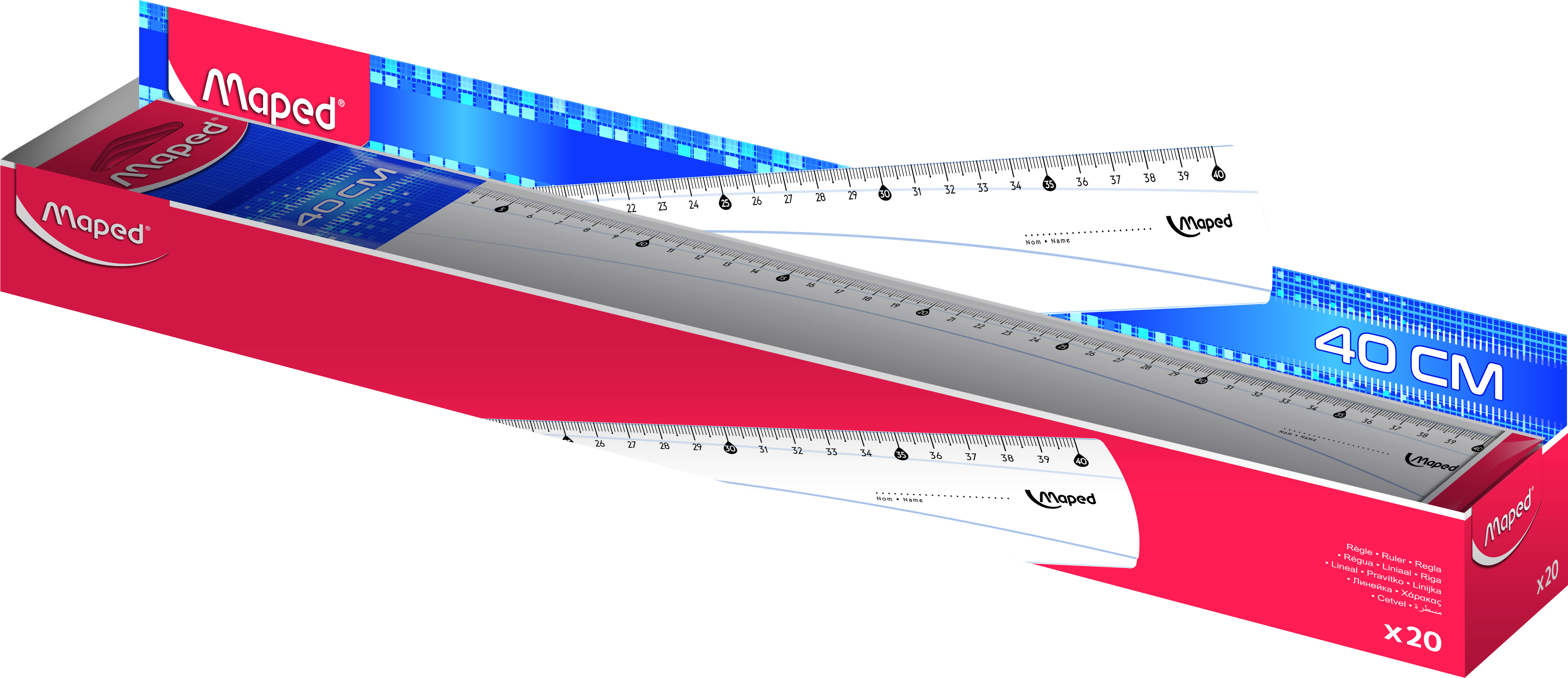 Linijki Classic wykonane z plastiku. idealnie przejrzyste. Skala wytłoczona tuszem. odpornym na promieniowanie UV. Wyróżnione wartości co 5 cm. Każda linijka pakowana w torebkę z zawieszką. Atrakcyjne. kolorowe opakowanie zbiorcze. Długość 40 cm.