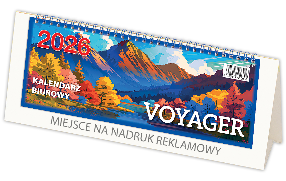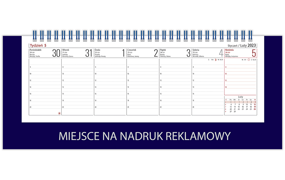 Podłużny kalendarz biurowy stojący. Podział godzinowy dnia pracy pozwala na dokładne planowanie dnia. Kalendarium skrócone aktualnego miesiąca na każdej stronie. Podstawka ze sztywnego kartonu zadrukowana w kolorze granatowym (H4-G), kremowym (H4-K) lub białym (H4-B).