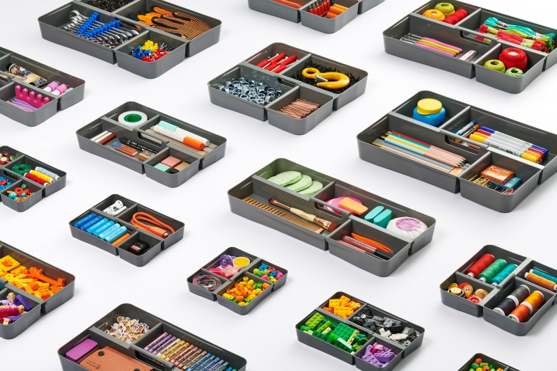 pojemnik Insert Box wyposażony w pokrywę z rączką, zamknięcie na dwa mocne klipsy oraz wyjmowaną wkładkę z uchwytem i czteroma przegródkami doskonałą do segregowania drobiazgów