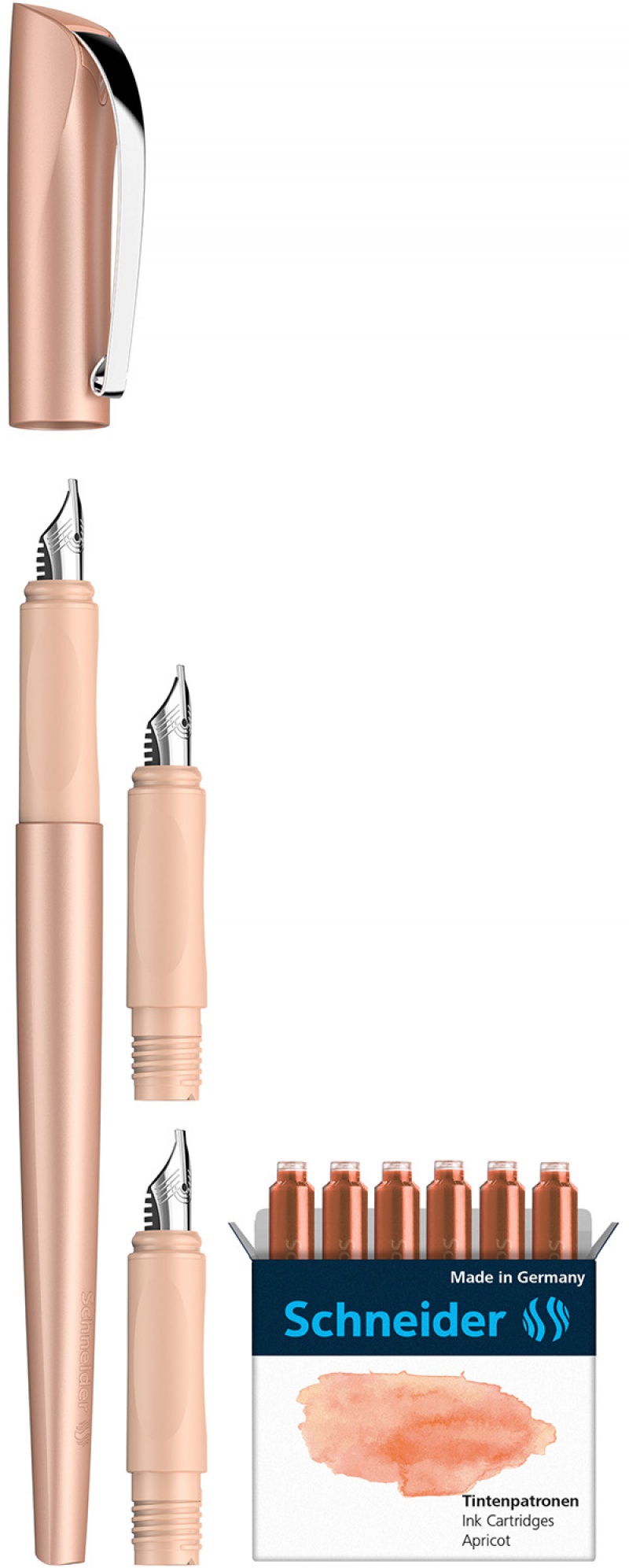 zawartość zestawu: Pióro wieczne do kaligrafii o grubości linii pisania 1,1 mm, dwie zapasowe końcówki o grubości 1,5 mm i 1,8 mm oraz 6 x naboje atramentowe Apricot