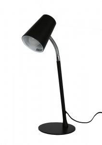 Czarna, elegancka lampka biurkowa z włącznikiem na kablu. Elastyczne ramię umożliwia szeroki zakres ruchów. Klosz wewnątrz został pokryty emalią dla lepszego odbijania światła.
