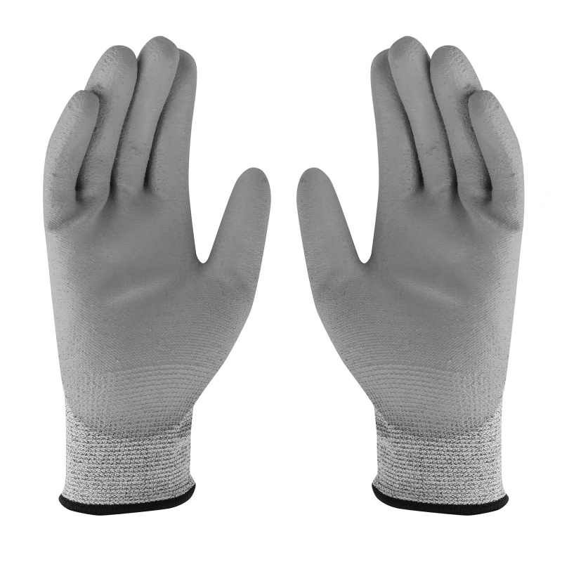 rękawica dziana ze splotu włókien polietylenowych o ultra wysokiej wytrzymałości (UHPPE), włókna szklanego i miękkich włókien elastycznych typu spandex w kolorze szarym