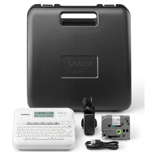 Model PT-D410VPYJ to niewielkie, łatwe w obsłudze urządzenie, która drukuje wyraźne, laminowane etykiety. Pomagają one w dostosowaniu ważnych plików i folderów, identyfikacji urządzeń oraz kabli w domowym biurze.