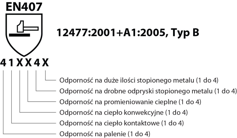 zgodność z normami EN 388:2016+A1:2018 (3121X), EN 407:2004 (41XX4X), EN ISO 21420:2020, EN 12477:2001+A1:2005, Typ B
