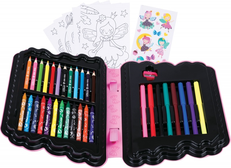 zawartość: 12 kredek ołówkowych, 8 flamastrów, 12 kredek świecowych, 5 kolorowanek, 16 naklejek oraz temperówka