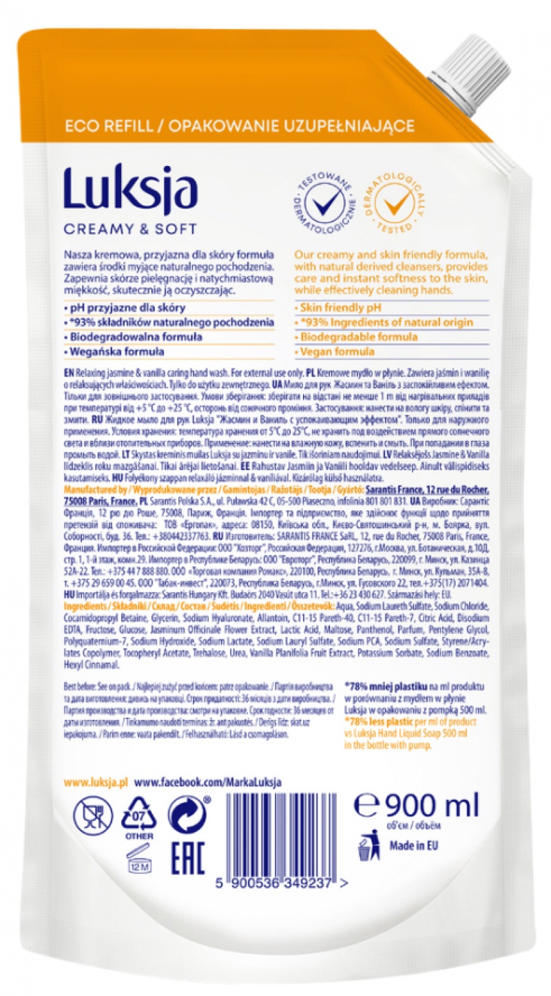 skład: Aqua, Sodium Laureth Sulfate, Sodium Chloride, Cocamidopropyl Betaine, Glycerin, Sodium Hyaluronate, Allantoin, C11-15 Pareth-40, C11-15 Pareth-7, Citric Acid, Disodium EDTA, Fructose, Glucose, Jasminum Officinale Flower Extract, Lactic Acid, Maltose, Panthenol, Parfum, Pentylene Glycol, Polyquaternium-7, Sodium Hydroxide, Sodium Lactate, Sodium Lauryl Sulfate, Sodium PCA, Sodium Sulfate, Styrene/Acrylates Copolymer, Tocopheryl Acetate, Trehalose, Urea, Vanilla Planifolia Fruit Extract, Potassium Sorbate, Sodium Benzoate, Hexyl Cinnamal