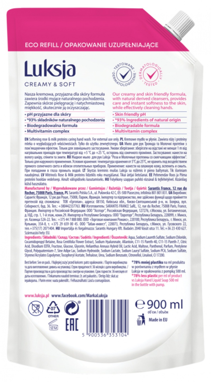 skład: Aqua, Sodium Laureth Sulfate, Sodium Chloride, Cocamidopropyl Betaine, Rosa Centifolia Flower Extract, Sodium Hyaluronate, Allantoin, C11-15 Pareth-40, C11-15 Pareth-7, Citric Acid, Disodium EDTA, Fructose, Glucose, Glycerin, Helianthus Annuus Hybrid Oil, Lactic Acid, Maltose, Panthenol, Parfum, Pentylene Glycol, Polyquaternium-7, Sine Adipe Lac, Sodium Hydroxide, Sodium Lactate, Sodium Lauryl Sulfate, Sodium PCA, Sodium Sulfate, Styrene/Acrylates Copolymer, Tocopheryl Acetate, Trehalose, Urea, Sodium Benzoate, Citronellol, Linalool, CI 17200