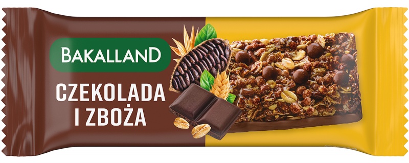 baton zbożowy z kawałkami czekolady oraz polewą o smaku czekoladowym
